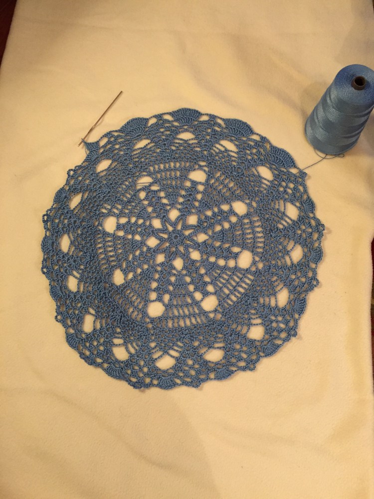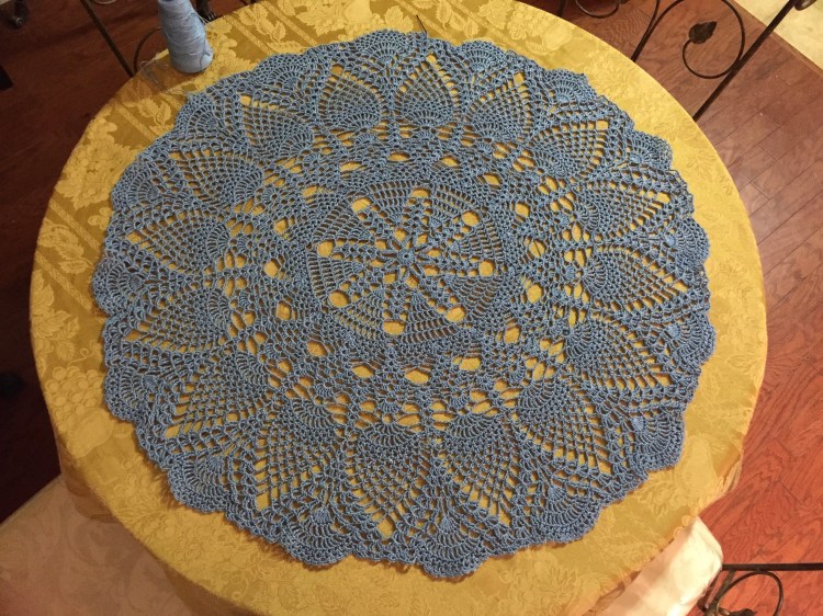 I continue to work on this pineapple table cloth. I’ll have to order another cone of this blue cotton crochet thread size 3. Can’t wait to get this done.
