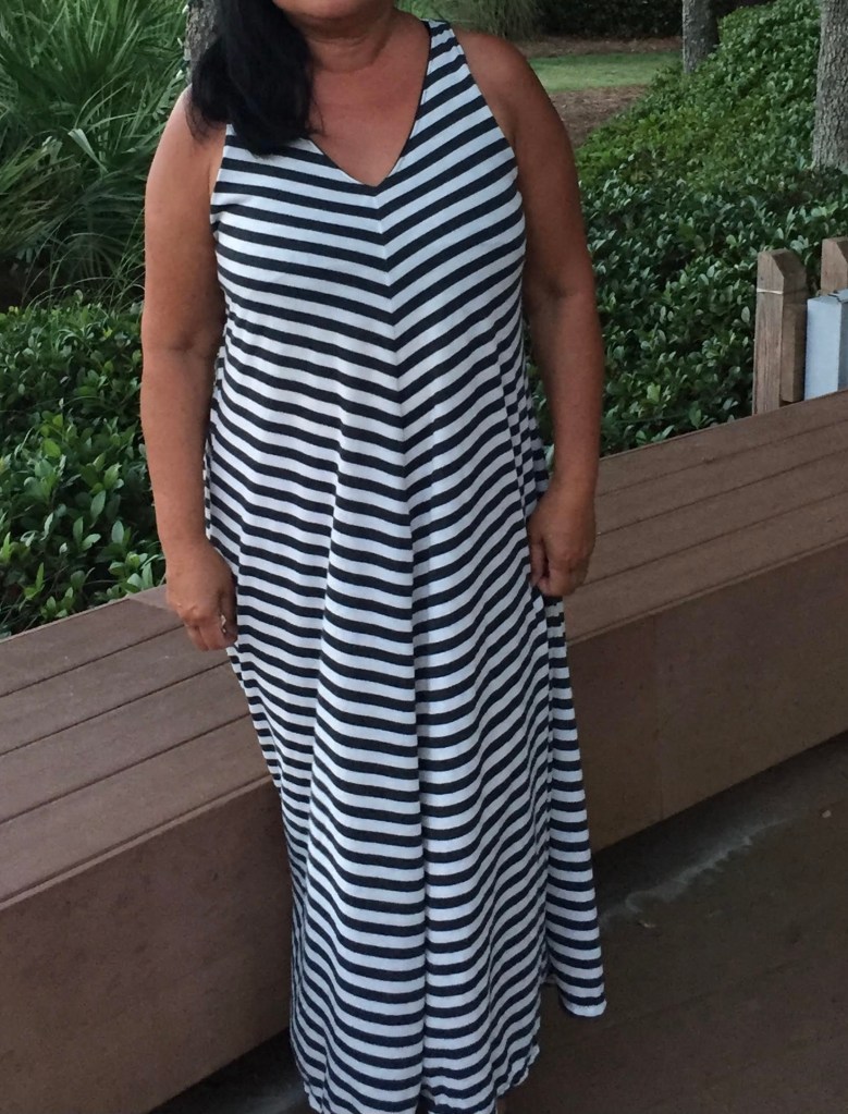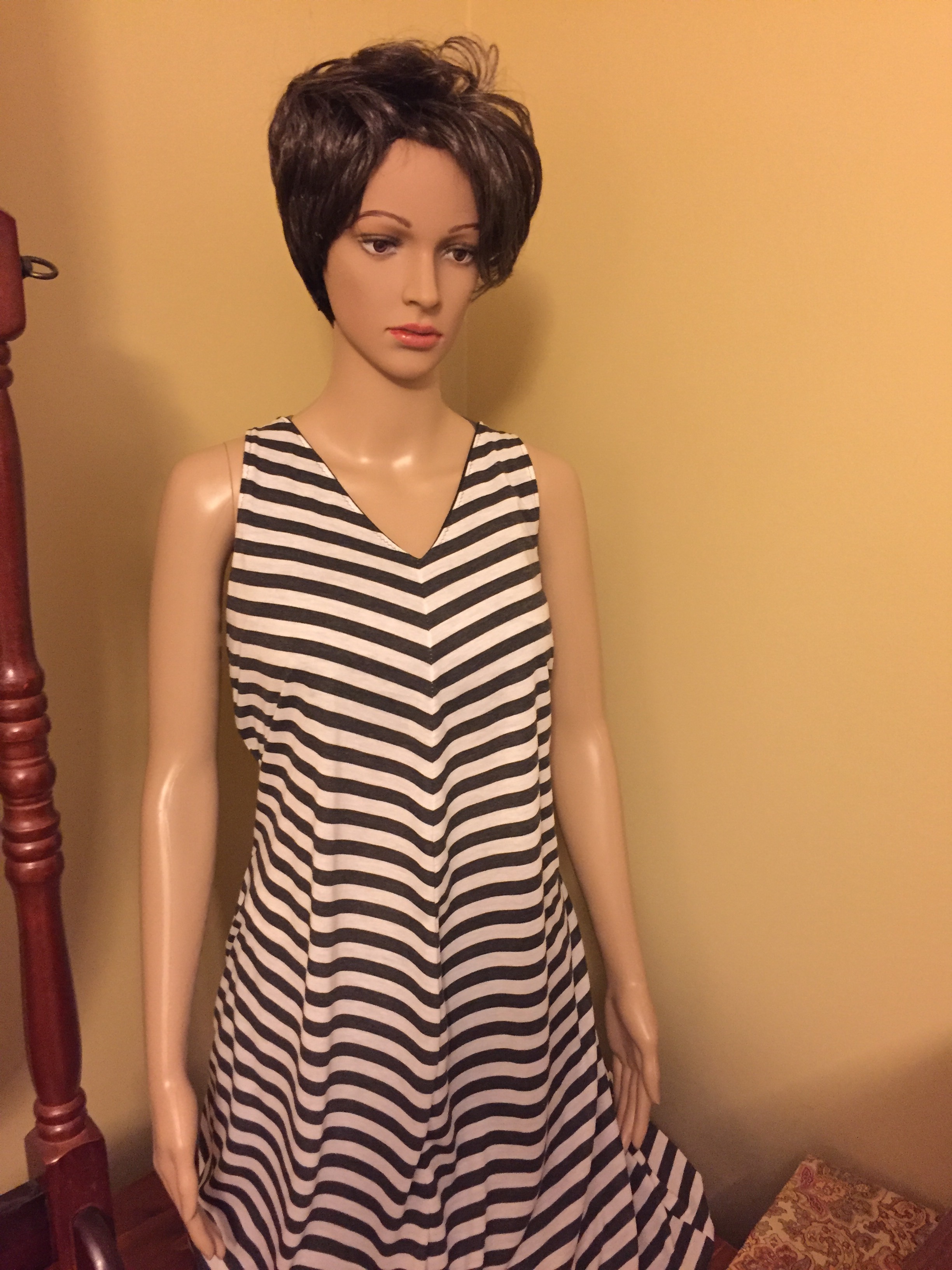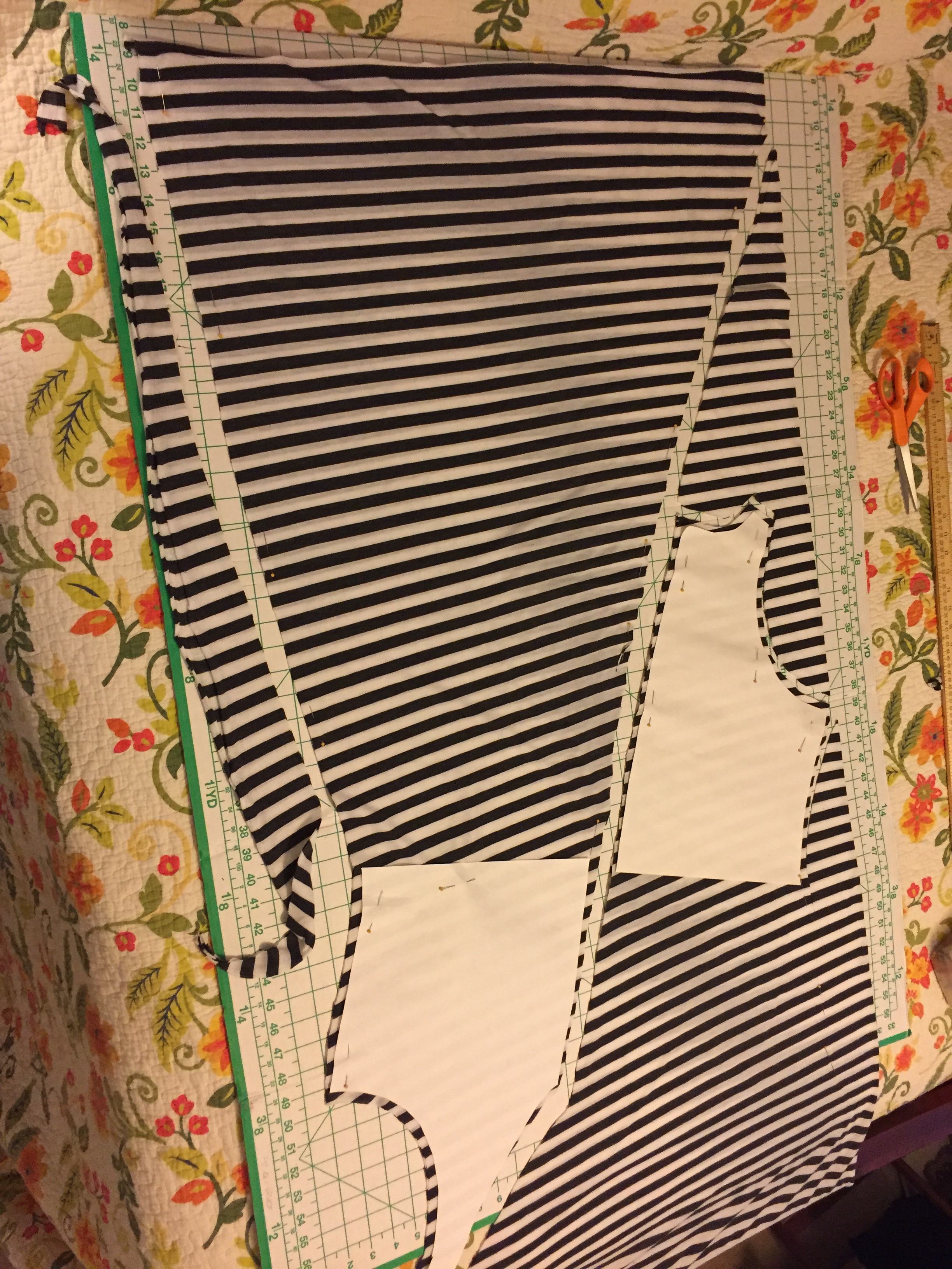 I wanted a specific style so that the neckline and armholes matches my sports bra which I prefer wearing to regular bras. The bra strap will not show when I wear the summer dress. Below is the photo of how I laid the pattern over a striped fabric so that it creates a “V” effect on the front and back center of the dress.